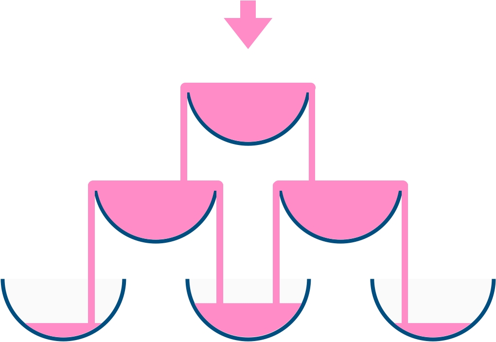 Then, some champagne is poured into the first glass at the top. When the topmost glass is full, any excess liquid poured will fall equally to the glass immediately to the left and right of it. When those glasses become full, any excess champagne will fall equally to the left and right of those glasses, and so on. (A glass at the bottom row has its excess champagne fall on the floor.)