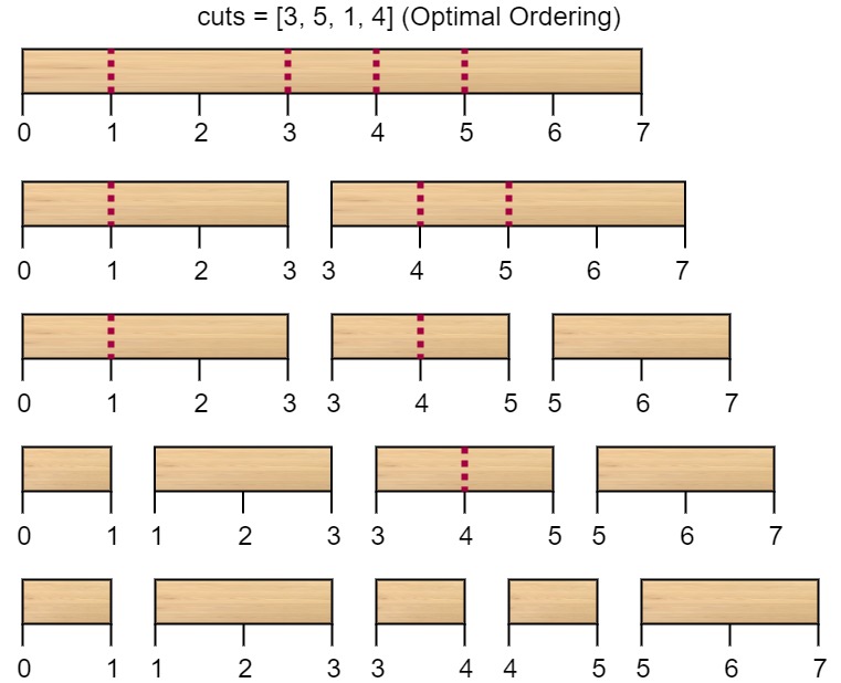 Rearranging the cuts to be [3, 5, 1, 4] for example will lead to a scenario with total cost = 16 (as shown in the example photo 7 + 4 + 3 + 2 = 16).Intuition