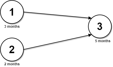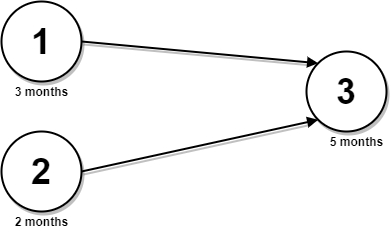 Input: n = 3, relations = [[1,3],[2,3]], time = [3,2,5]