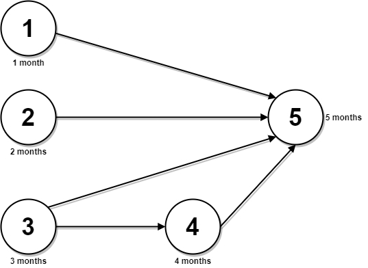Input: n = 5, relations = [[1,5],[2,5],[3,5],[3,4],[4,5]], time = [1,2,3,4,5]