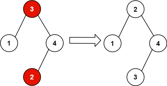 Explanation: 2 cannot be in the right subtree of 3 because 2 < 3. Swapping 2 and 3 makes the BST valid.Intuition